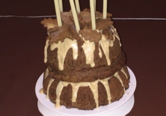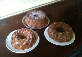 Fresh apple and pecan spice bundt cakes, with butterscotch glaze and gilded gingerbread leaves